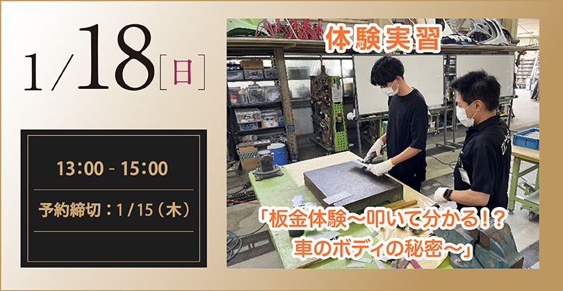 車体整備工学科があるKICだけの体験実習。鉄板を切ったり、凹凸をハンマーで叩いて伸ばしたり、ボディ修復の基礎を体験。