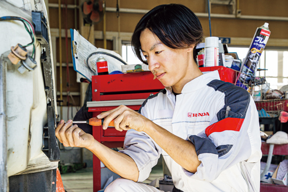 もともと父がクルマの整備販売の会社を経営していて、自分たち兄弟3人はみんな後継者になるためにKICで学びました。自分は姉や兄とは違う部門で新たなチャレンジをしたいと思って、選択したのが車体整備工学科です。卒業後は、新しく板金・塗装部門を立ち上げるという前提で、5年間の期限付きで父の知人の会社で修行をさせていただきました。その会社は作業台数が多いところだったので、残業も結構やっていましたし、体力的にもかなりきつかったけど、とにかく技術を身につけなければという感じで頑張りました。3年前に地元に帰ってきて、最先端の設備を揃えて「鈑金のコバック」をオープンさせました。フランチャイズにしたのは、ネームバリューがあって、すぐに信頼してもらえると考えたからです。KICで教わった板金・塗装のノウハウはもちろん、当時取得した積載、レッカー、クレーン、大型、玉掛けなどの免許や資格がかなり役立っています。在校生の皆さんには、時間がある学生のうちに免許や資格をできる限り多く取っておくことをお勧めします。板金・塗装は技術を高めれば高めるほど楽しいので、さらに腕を磨いて極めていきたいと思っています。そして、地域№1の板金工場、県内で仕上がりがいいと有名になるような工場をめざしています。そうすることで、しっかり利益を出して、社員に大きく還元できる会社にしていきたいです。
